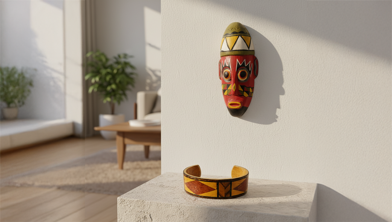 A lightweight wooden cuff featuring hand painted geometric patterns that blend bold artistry with everyday wearable style.
